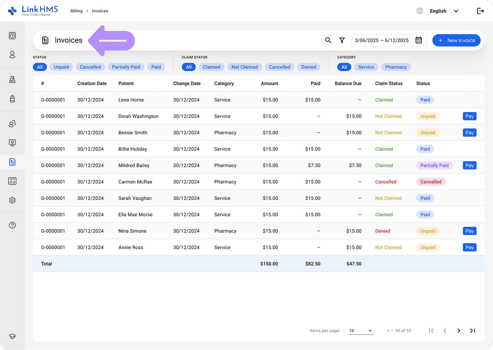 The updated Invoices tab makes it simple to filter invoices by status, claim status, or category, helping you quickly narrow down the results. You can also view key details such as Patient, Amount, Paid, and Balance Due at a glance to faster identify necessary invoices and manage them more efficiently.