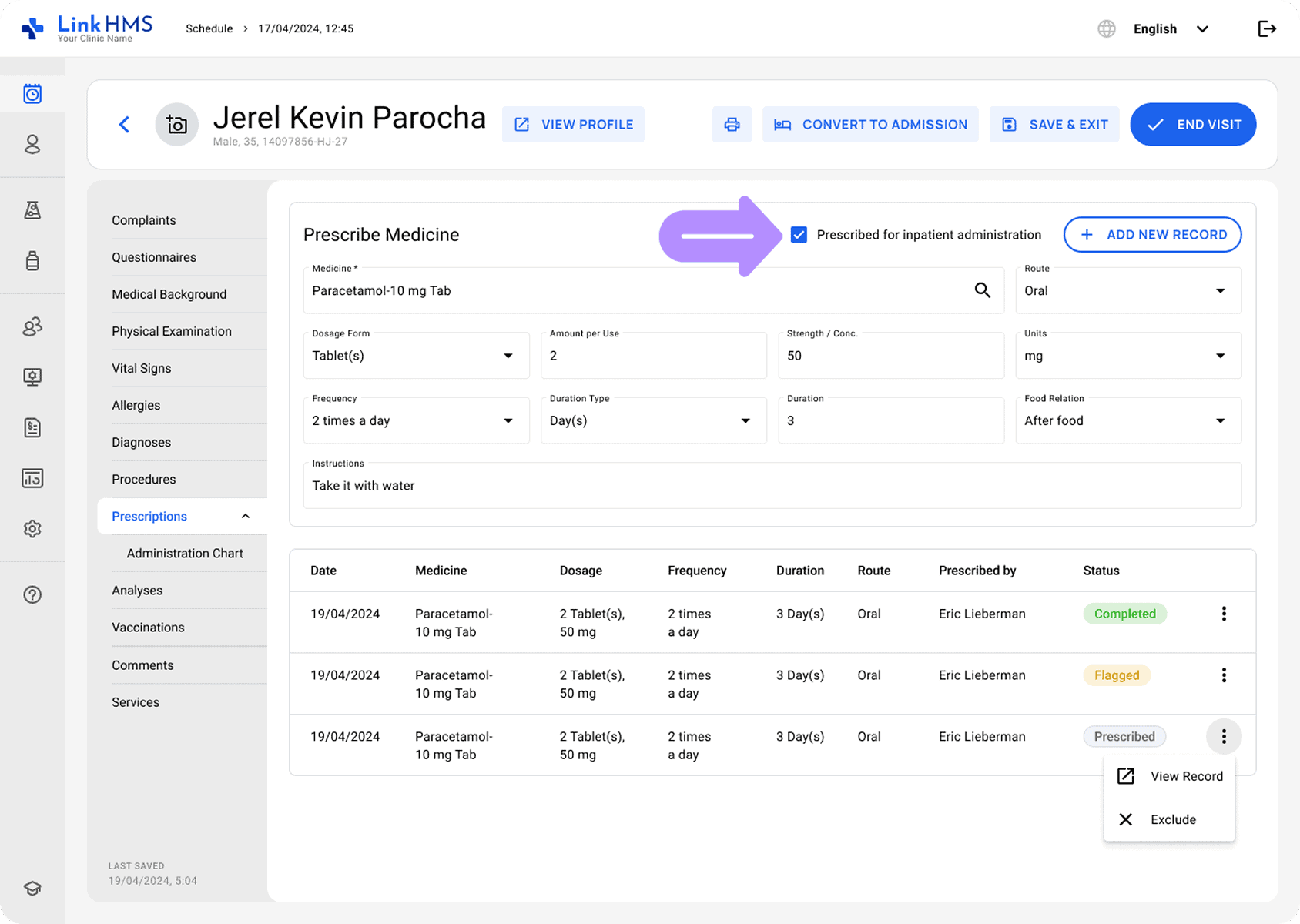 You can locate the chart in the patient’s EMR, visits, or admissions, now added as a new sub-tab under the prescriptions. It helps your clinic centralize all medication activities in a single, real-time view. Whether a patient is receiving scheduled intravenous therapy or a one-time pain reliever, every medication can be administered with the included functionality of LinkHMS.